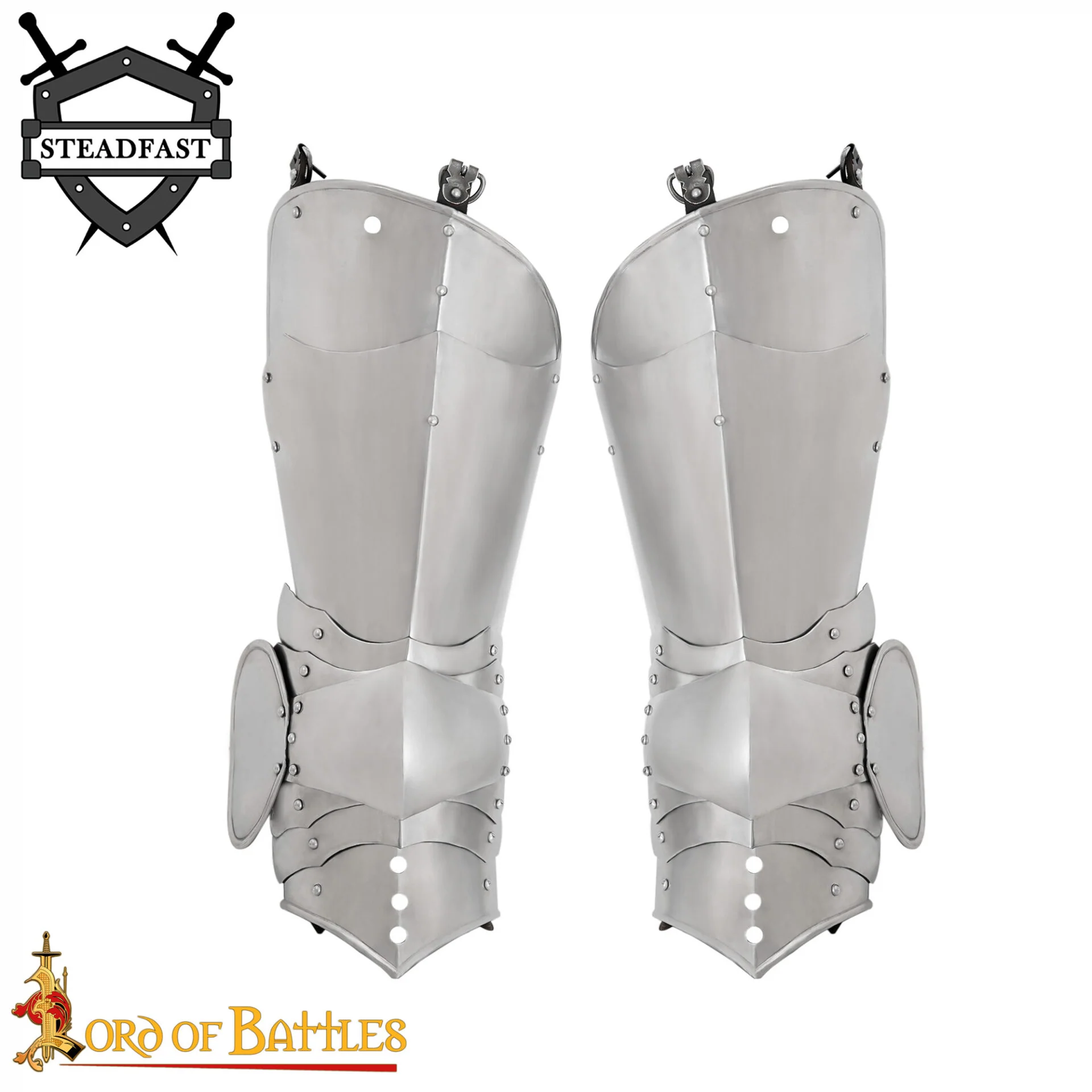 Tres fuertes correas de cuero con hebillas de acero forjadas a mano garantizan un cierre fiable sobre los pantalones del gambes贸n o las perneras acolchadas. El acabado de acero pulido no s贸lo parece aut茅ntico, sino que tambi茅n ayuda a resistir la corrosi贸n cuando se mantiene adecuadamente.