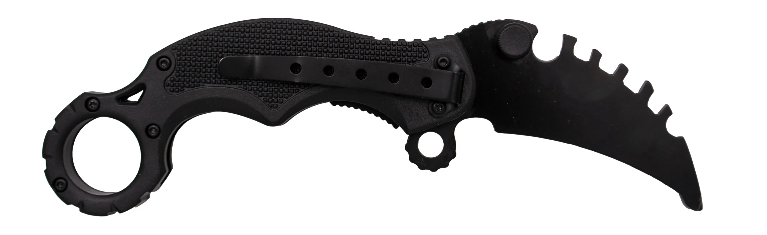 Navaja asistida Third K3105 Modelo de práctica (sin filo), Mango de plástico negro con imprimación de calaveras, hoja de acero 420 de 6,2 cm en negro sin filo. Con clip. Ref. K3105