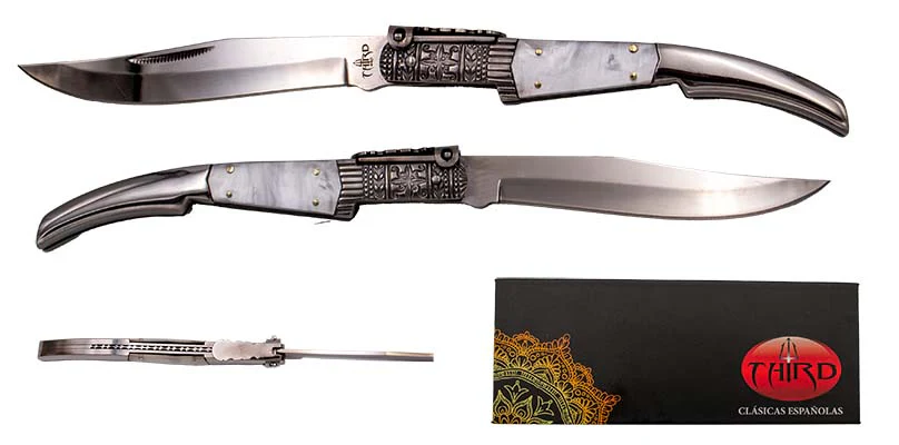 Navaja de carraca de Third Serie Seda Perla N49BD, realizadas con tecnologÃa CNC, mango con virolas de acero inoxidable con bajo relieve decorativo basado en navajas clásicas españolas del siglo XIX e inserciones de acrÃlico blanco, hoja de acero 440 acabada en brillo espejo de 11 cm, con el muelle y la palanquilla decorada. Con caja de presentación. Ref. N49BD