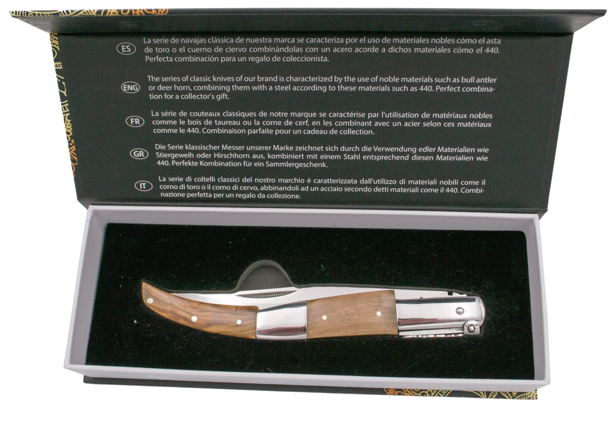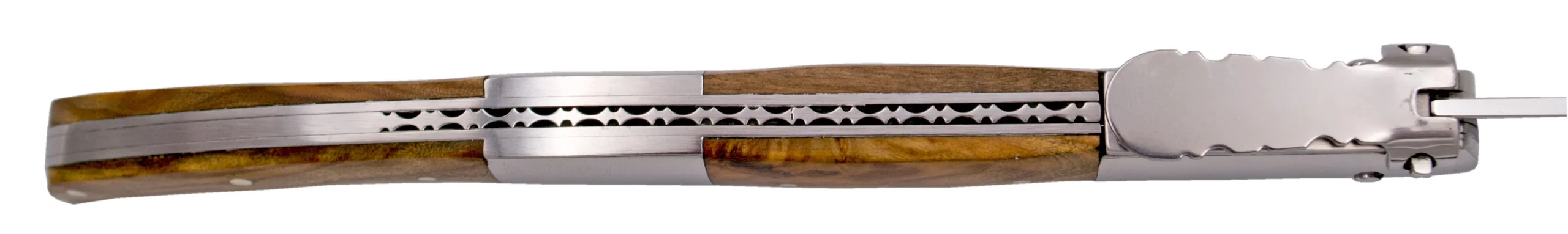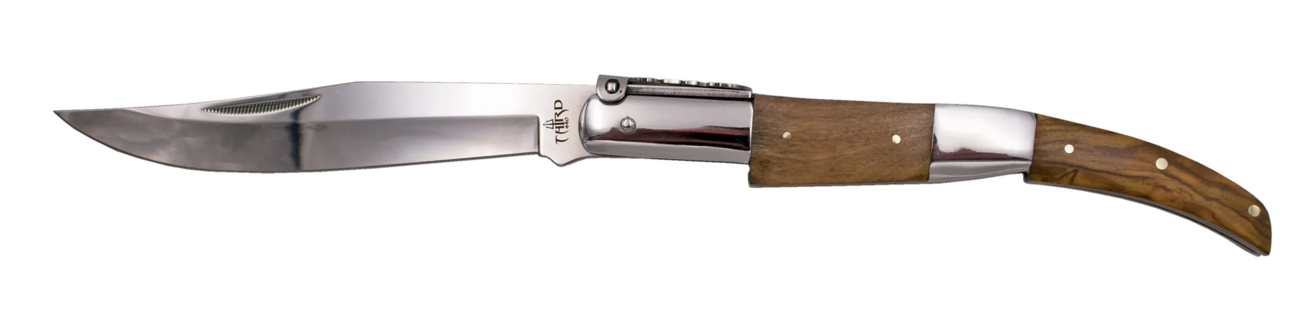 Navaja de carraca de Third Serie Ámbar N55O, realizadas con tecnología CNC, mango con virolas de acero inoxidable acabadas en brillo espejo e inserciones de madera de Olivo, hoja de acero 440 acabada en brillo espejo de 15 cm, con el muelle y la palanquilla decorada. Con caja de presentación. Ref. N55O