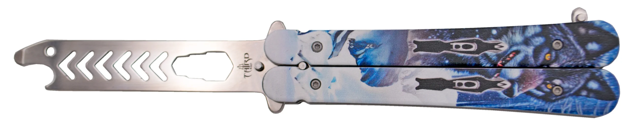 Navaja de abanico SKI Third K2472 hoja de acero 420 multiusos acabado brillo espejo de 9,4 cm, mango de alumino con impresión 3D de Lobo. Ref. K2472