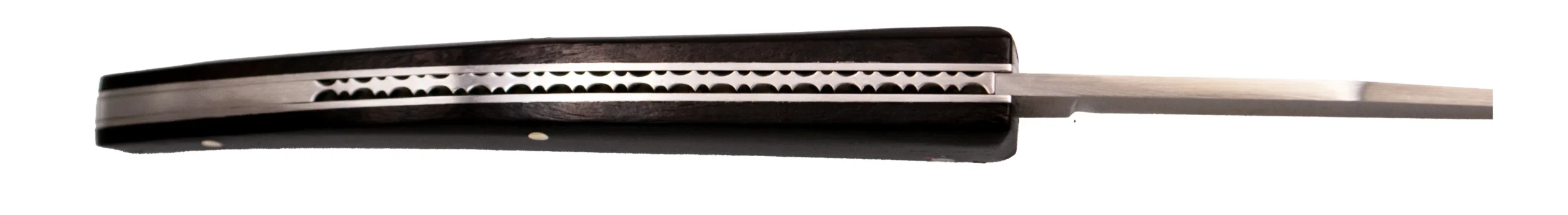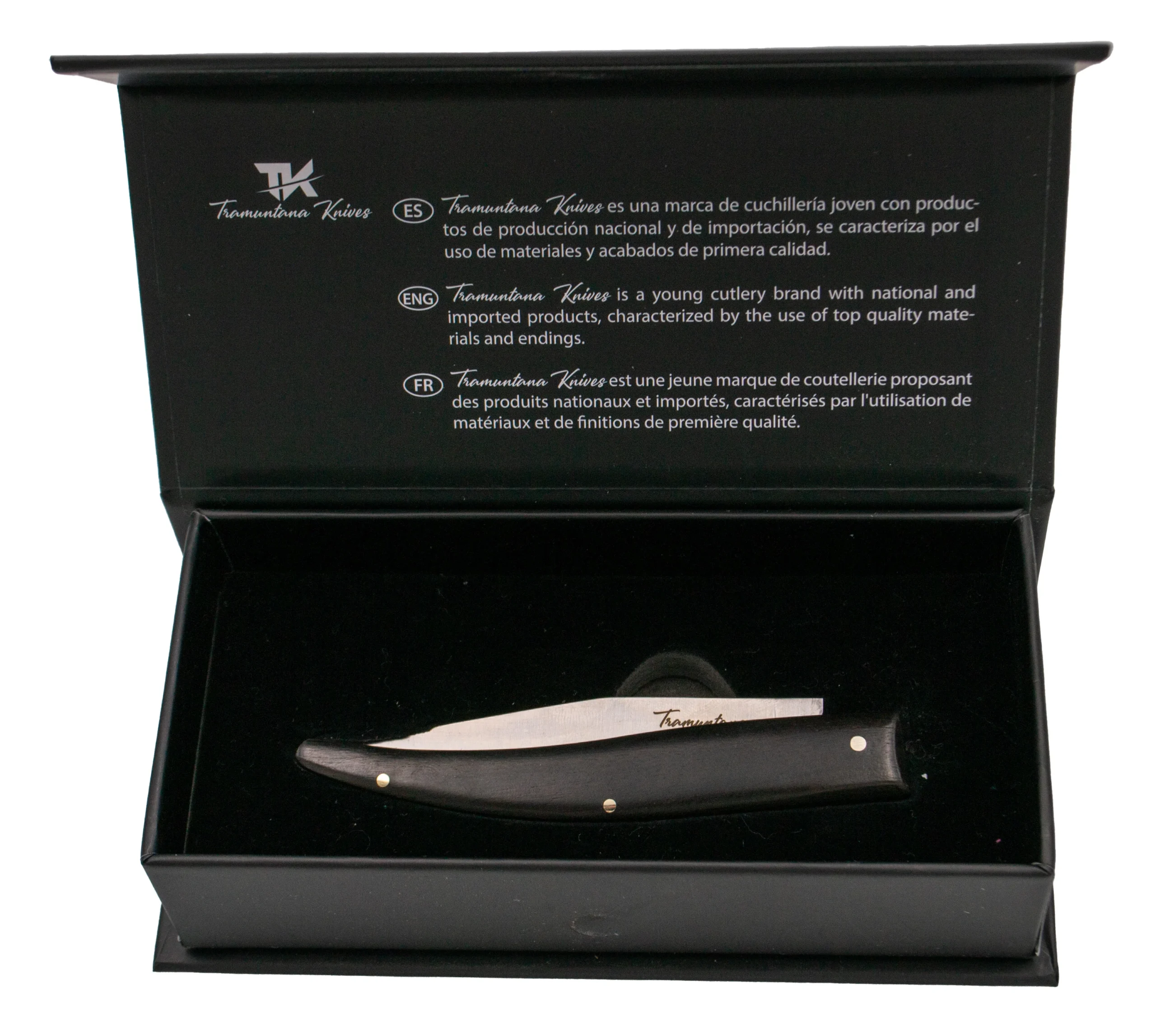 Navaja Punta Tramuntana Knives N92E mango de madera de ébano, hoja de acero 440 acabada en satinado de 8,4 cm, navaja de doble pistón, Muelle decorado. Con caja de presentación. Ref. N92E