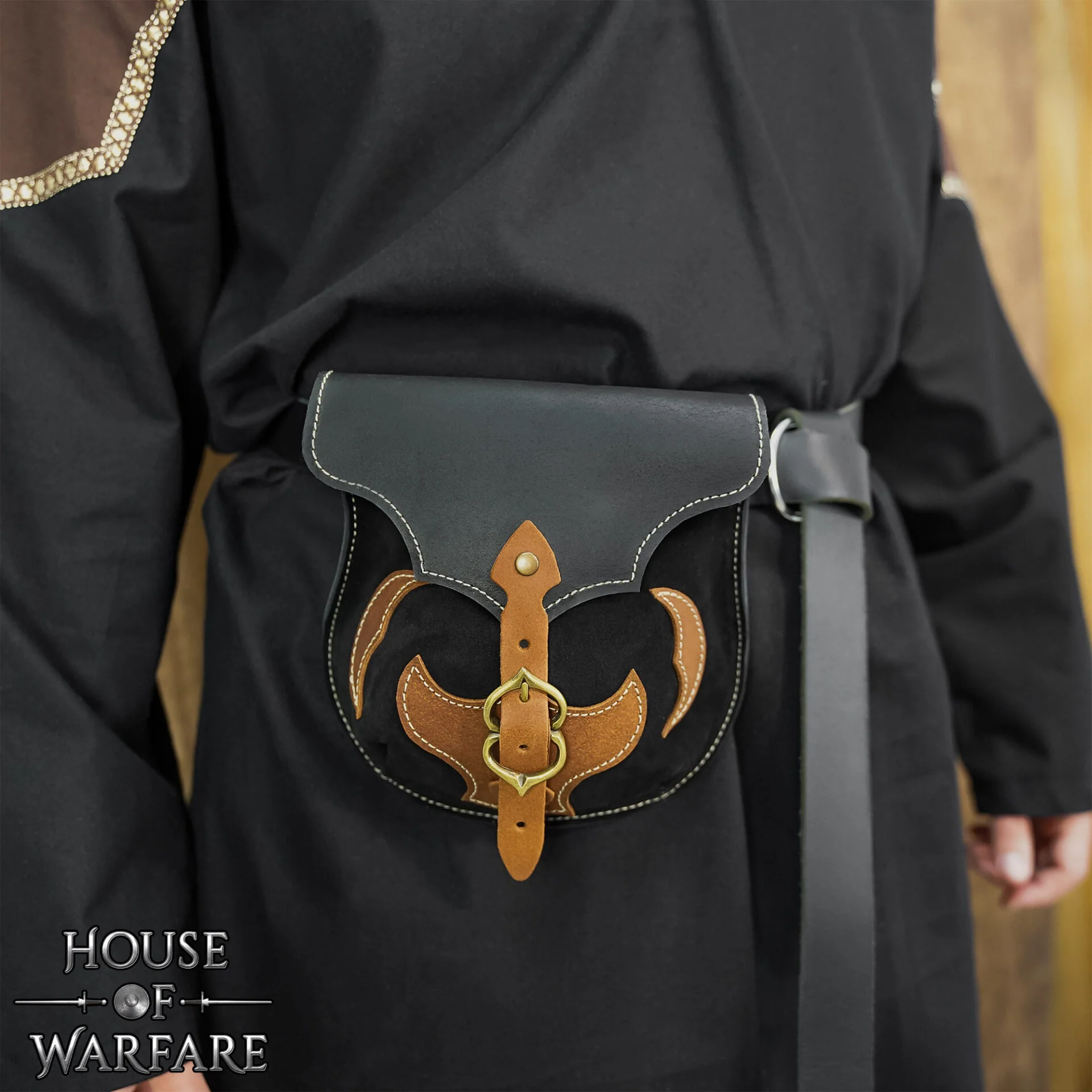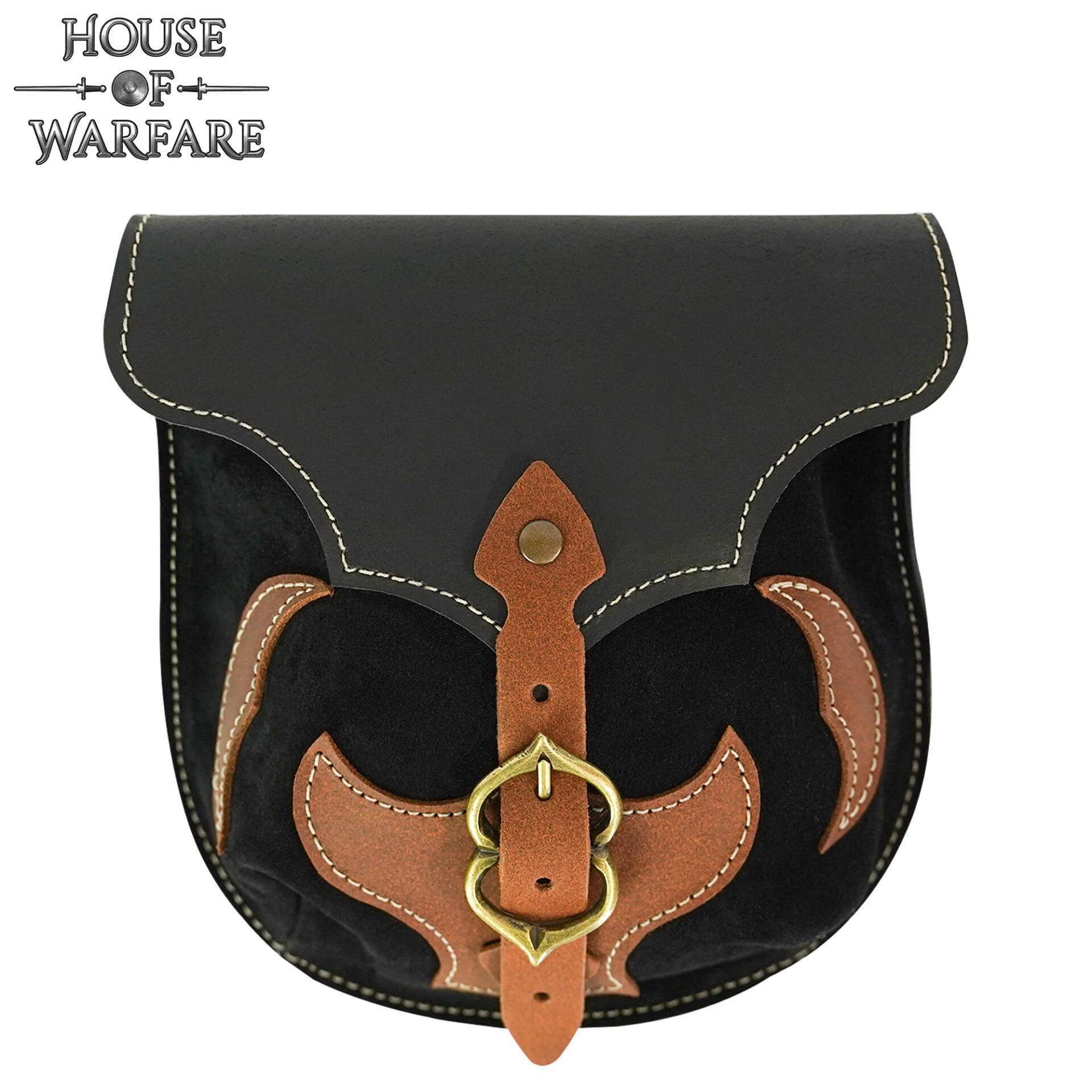 evoca el atrevido estilo de los aventureros y mercenarios de la Baja Edad Media. Fabricada en cuero resistente y adornada con un intrincado aplique marrón, combina funcionalidad y moda en una pieza llamativa. La solapa se cierra de forma segura con una larga correa de cuero y una hebilla de latón macizo, manteniendo tus pertenencias a salvo incluso durante los viajes o la vida de campamento.