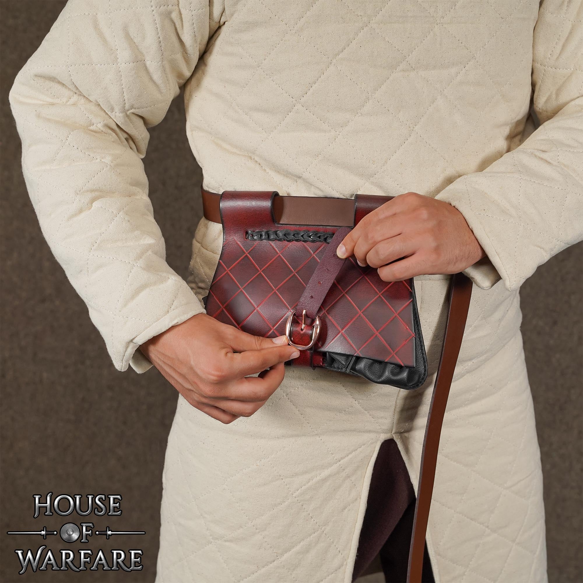 Aporta autenticidad y practicidad a tu disfraz medieval, de LARP o de fantasÃa con esta Riñonera Medieval de Cuero Hecha a Mano. Con unas medidas de 19,4 cm x 25 cm, esta bolsa de generosas dimensiones está fabricada en cuero auténtico de alta calidad en una llamativa combinación de negro intenso y ricos tonos granate.