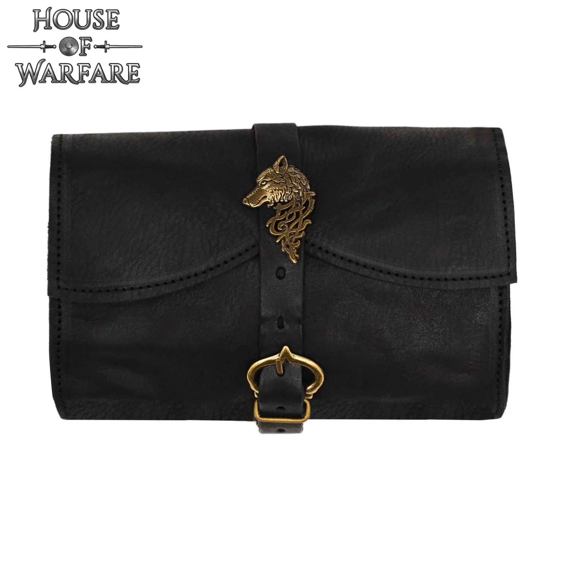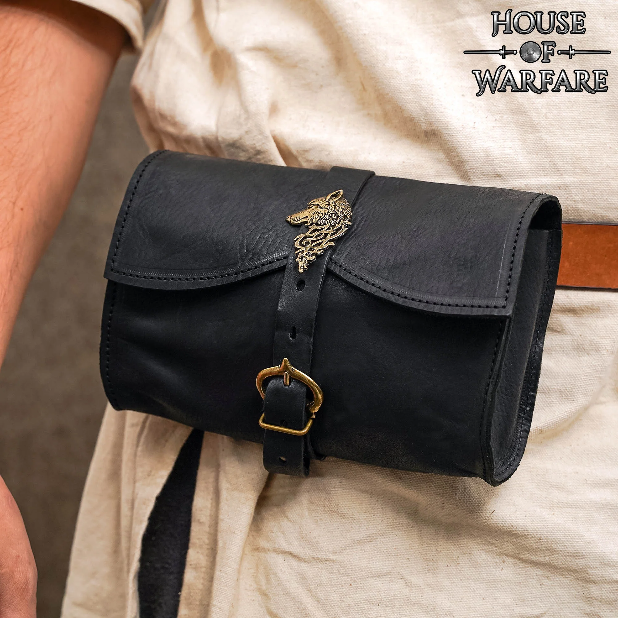 Riñonera medieval de cuero con emblema de lobo de latón