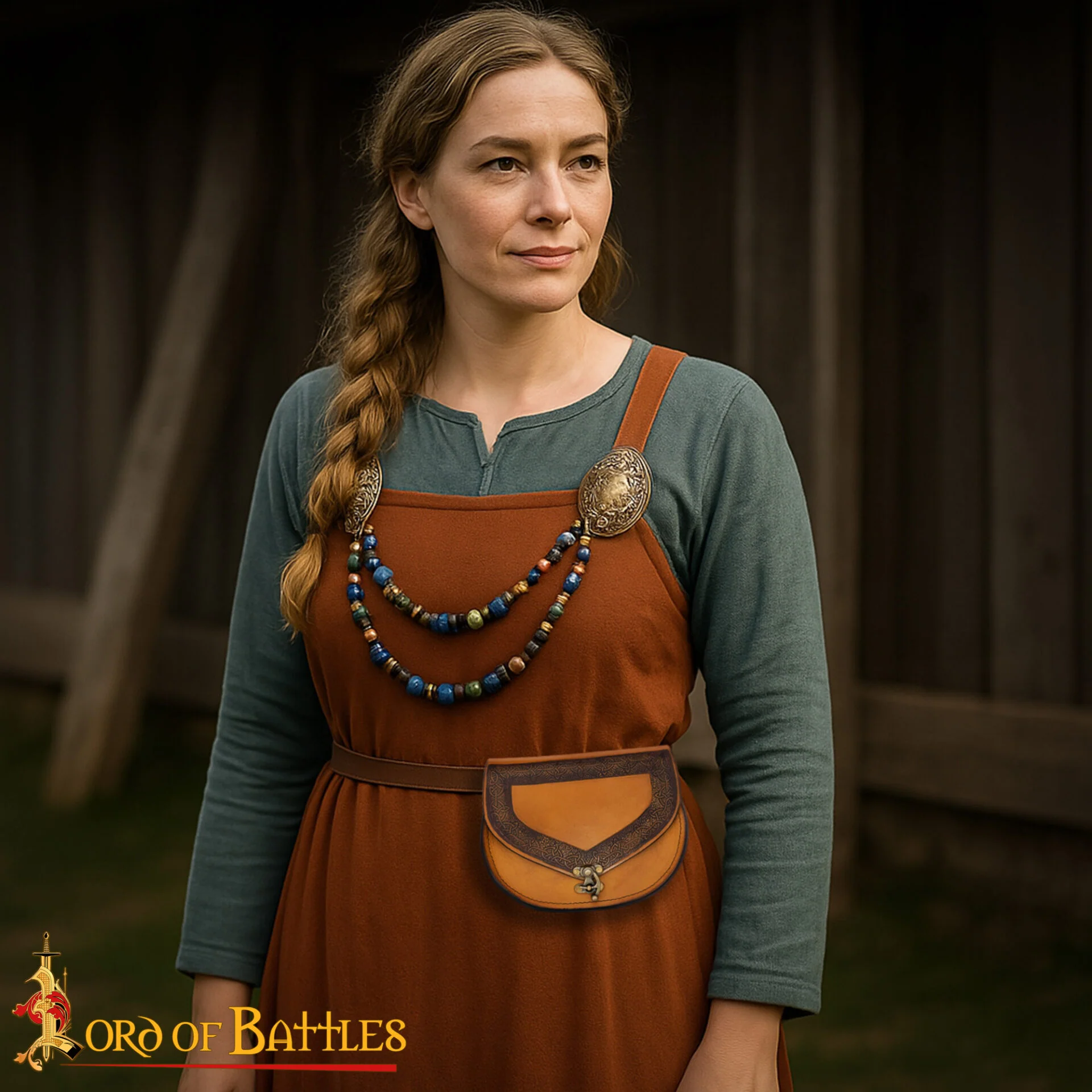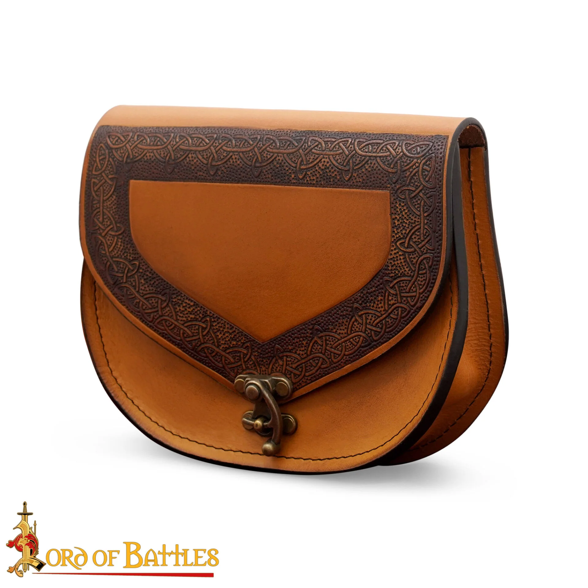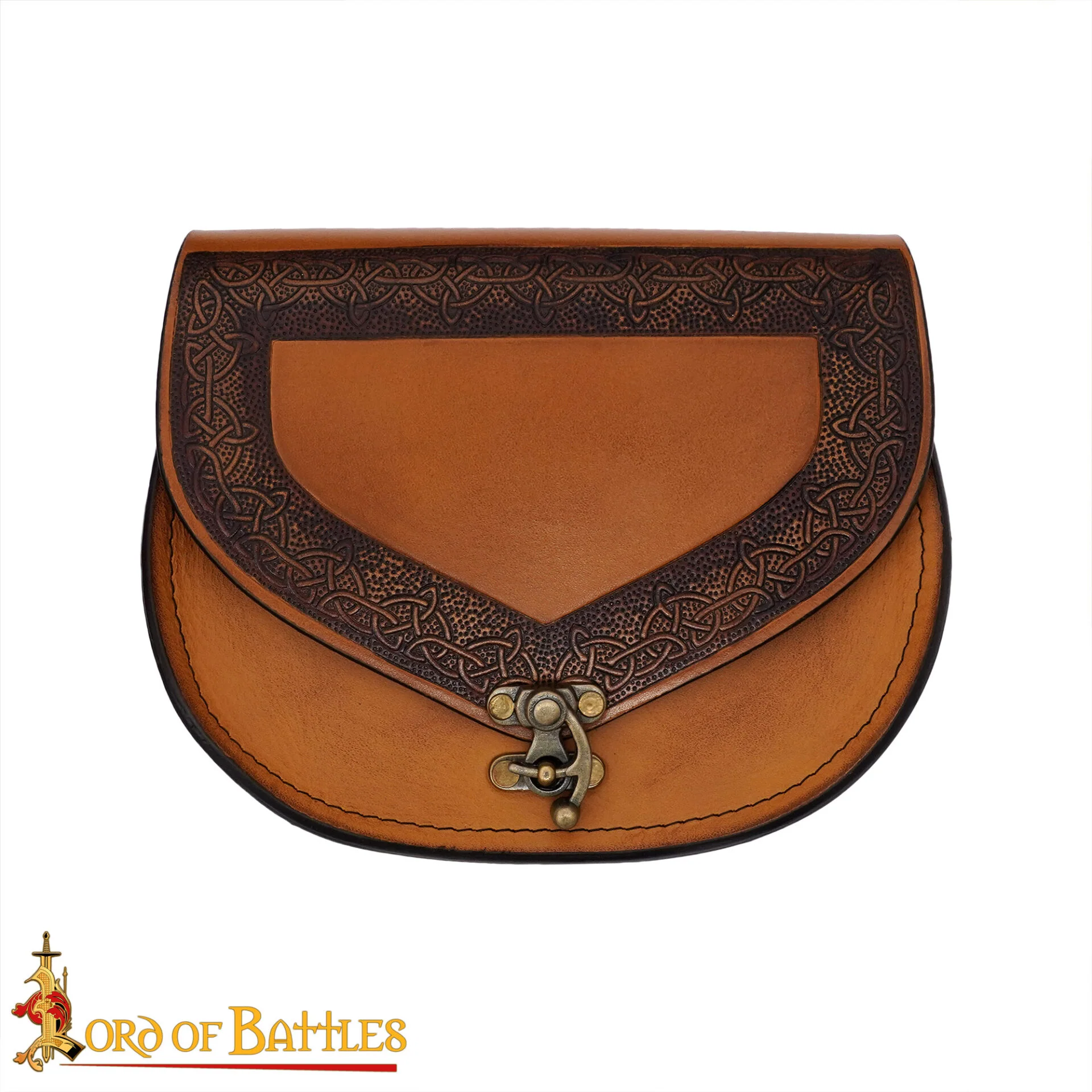 La solapa frontal luce un ornamentado motivo de nudos celtas en relieve que distingue a esta pieza por su detalle atemporal. El cierre de latón garantiza la seguridad de sus pertenencias, tanto si la lleva en el campamento como en una feria o durante un evento histórico.