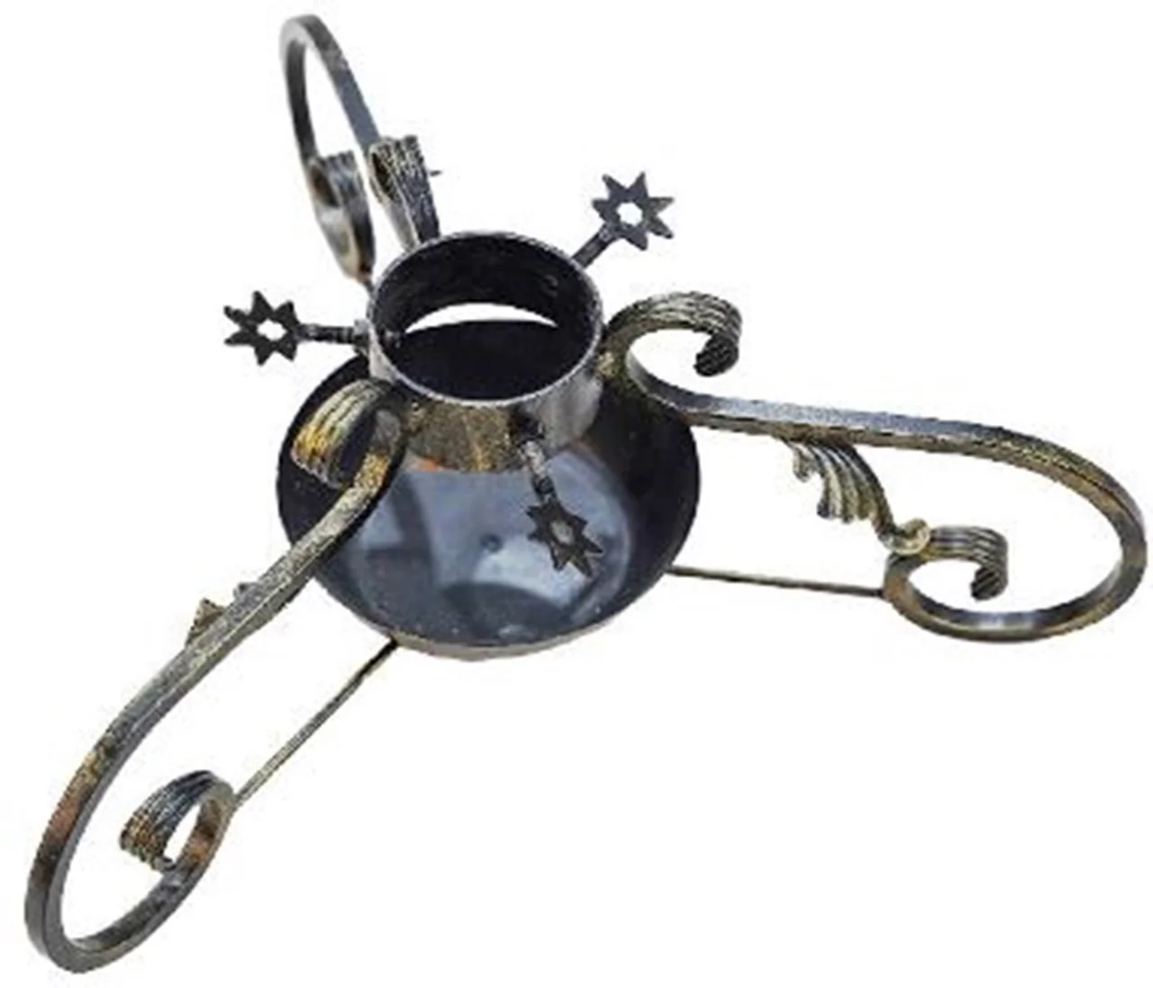 es una sorprendente fusión de fuerza y arte. Cada pieza está forjada a mano en estilo tradicional, con patas delicadamente enrolladas y detalles de tornillos en forma de estrella que recuerdan la artesanía de los herreros medievales. La superficie está acabada con un revestimiento negro de aceite curado al calor, que no sólo proporciona un carácter vintage, sino también una protección duradera contra los elementos. El soporte tiene una amplia base circular y un plato recogegotas integrado bajo el aro de la maceta para recoger el exceso de agua, ideal tanto para suelos interiores como para patios exteriores. Su robusta construcción puede sostener con seguridad un árbol en maceta de hasta 10 kg aproximadamente, por lo que es tan funcional como decorativo.