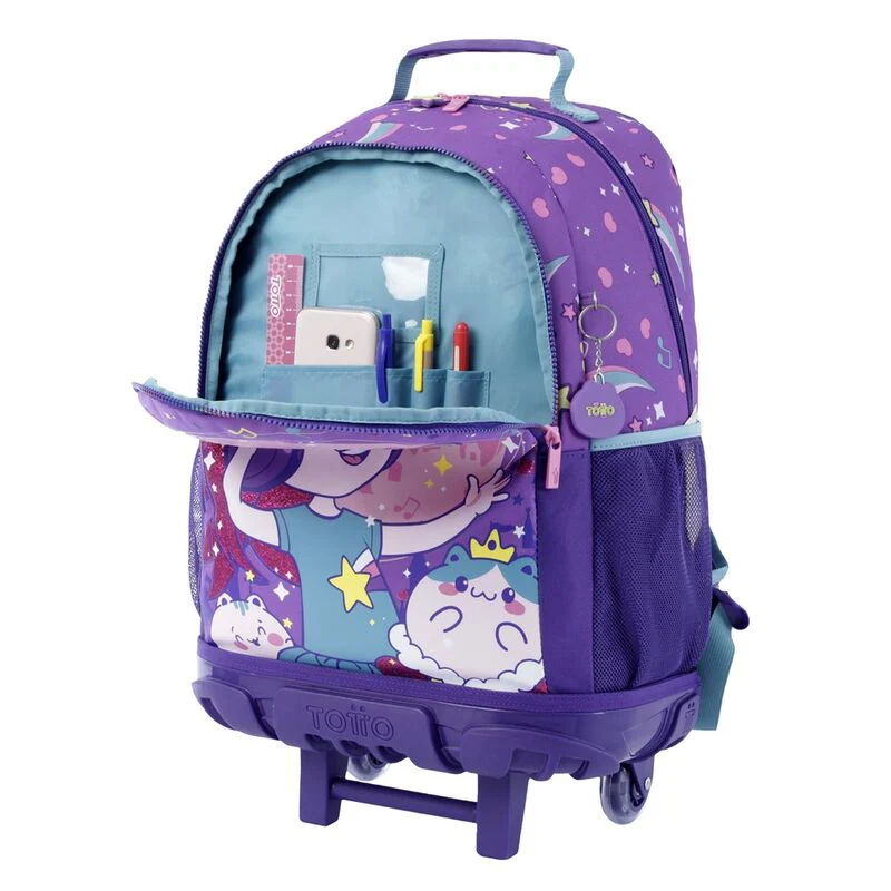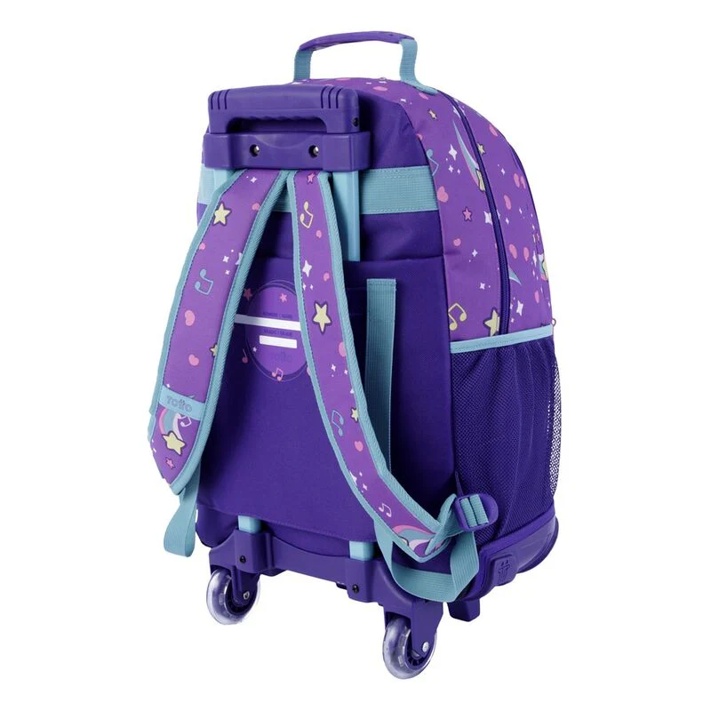 Tamaño: 34x48x22cm.el modelo grande con ruedas tiene una amplia capacidad de 35 litros por lo que será perfecto para llevar todo el material a clase sin que se hagan daño en la espalda. incorpora bolsillos laterales de malla para bebidas o botellas y un identificador en la parte posterior para poner el nombre y curso y evitar extravÃos.